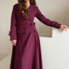 De rok heeft stretch. Het jasje heeft een getailleerde pasvorm. Het model is 1,70 m lang en draagt maat S.